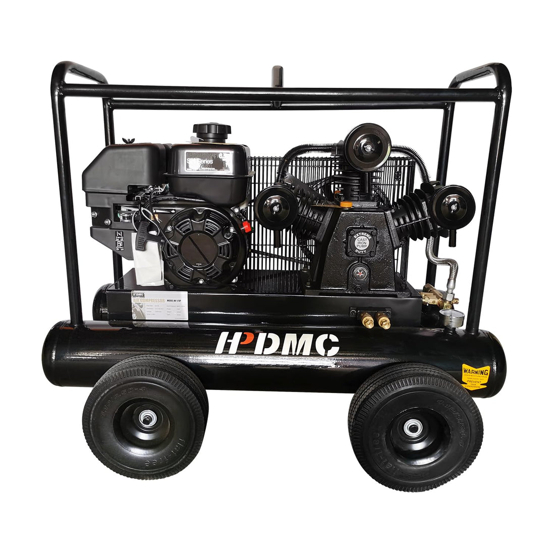 - Easy and Safe Operation: This gas-powered wheelbarrow compressor is durably designed with a cast iron frame for reliable, long-lasting use. An automatic start/stop pressure switch control with manual on/off lever offers easy operation, while the high-efficiency finger valves are easy to operate and maintain. Also can mounts in truck or service vehicle