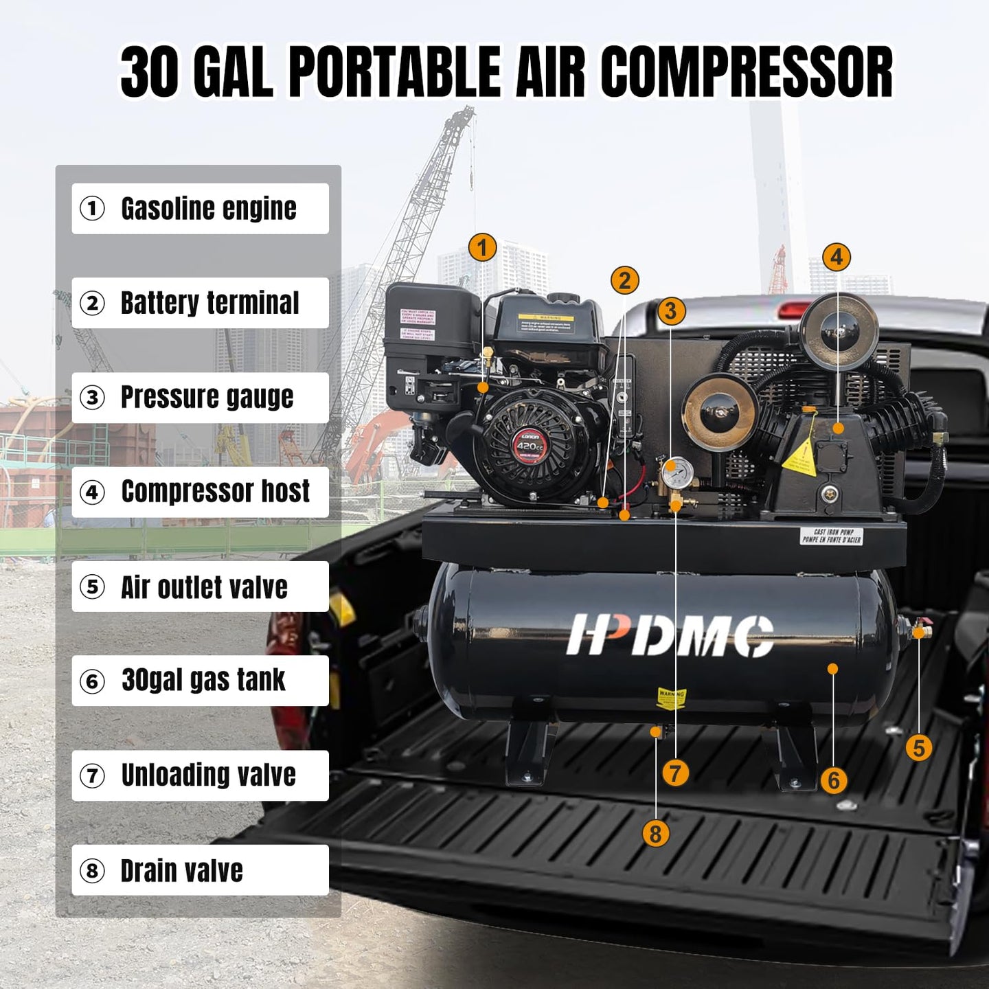 - Details Parameters: Power: 13HP; Tank: 30 Gal ASME; Max. Pressure: 180PSI; Air Flow Rate: 24CFM; Speed: 880 rpm; Type of Driven: Gasoline; NO. of Cylinders: 3; Output Pipe Diameter: NPT 1/2''; Combination Valve: Sufficient Sensitivity, Stability and Safety; EPA Certificate NO.: RCGPS.4202GR-019