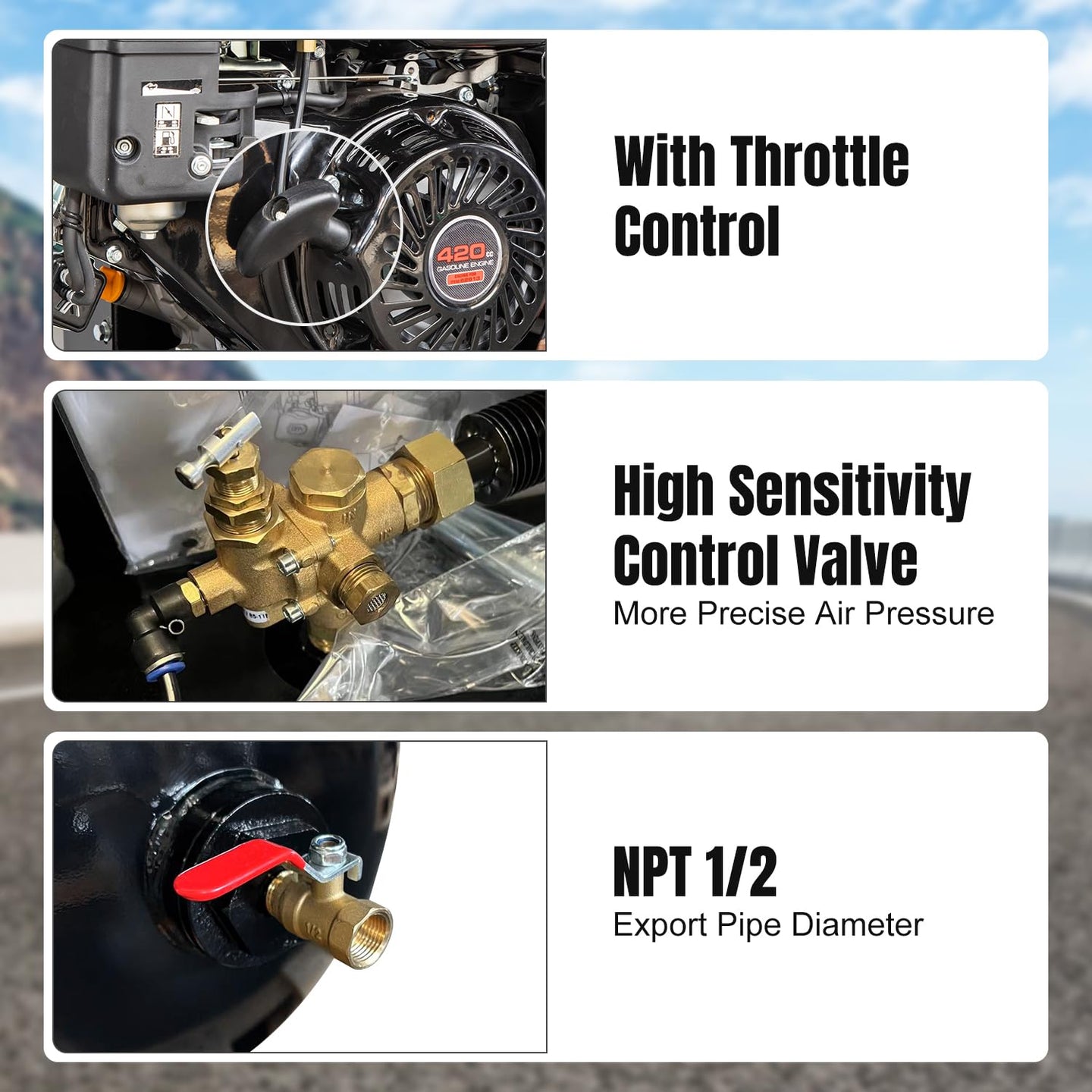 - ASME Tank: Gas powered air compressor with a 30-gallon ASME (American Society of Mechanical Engineers) tank can provide a longer duration of stable air supply. The ASME certification ensures that the tank meets safety and quality standards. ASME tank provides a reserve of compressed air, resulting in a more stable air supply over an extended period. The compressor can build up a substantial amount of compressed air in the tank, allowing it to meet the demand for air without needing to run continuously