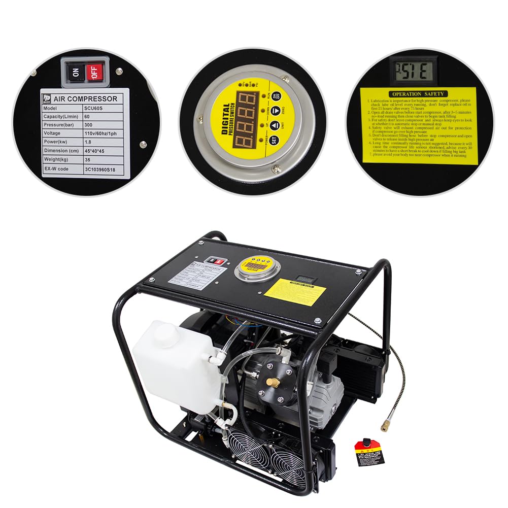 - Voltage Suply: 110v, Frequency: 60Hz, Current: 16Amp, Power: 1.8kw / 2.5HP, Flow Rate: 60-85L/min / 2.5-3cfm, Type: Single phase with advanced NEMA Plug.