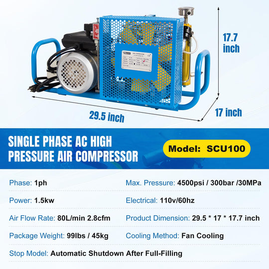Electric Air Compressor 110V/60HZ Parameter: Power: 1.5KW; Voltage: 110V/60HZ/1PH; Air Flow Rate: 80L/min (2.8cfm); Max. Pressure: 4500psi / 300bar /30MPa; No.of stage and cylinder: 4; Cooling Method: Fan Cooling; Stop Model: Automatic Shutdown After Full-Filling; Product...Sale price From $ 1,863.00Regular price $ 1,899.99Sale price From $ 1,863.00Regular price $ 1,899.99