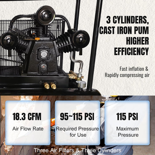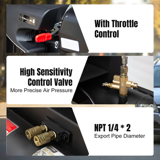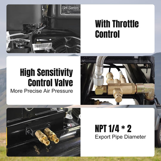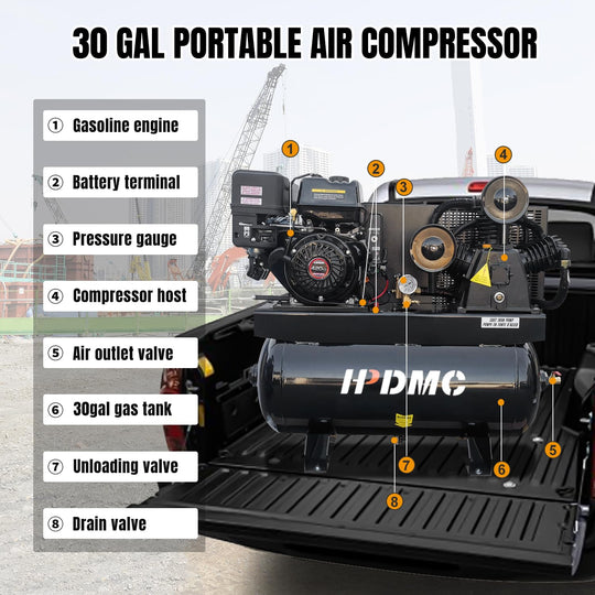 Portable Gasoline Powered Air Compressor TRV-0.3: 6.5HP 125PSI 9 Gal Specification: Power: 6.5HP; Tank: 9 Gal; Max Working Pressure: 125PSI; Air Flow Rate: 12CFM; Speed: 880 rpm; Output Pipe Diameter: NPT 1/4'' x 2; Type of...Sale price From $ 1,013.00Regular price $ 1,099.99Sale price From $ 1,013.00Regular price $ 1,099.99 -