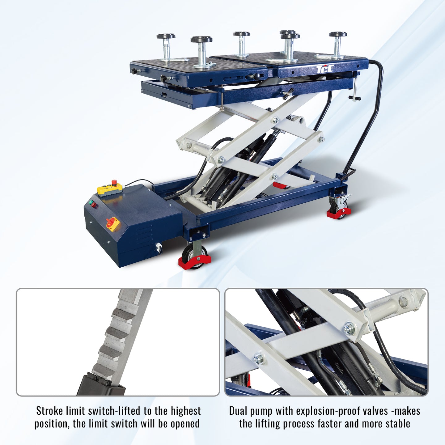 Features a 0.75kW dual-voltage motor (110V/220V) with push-button control for smooth 650-1840mm electric lifting and precise positioning.