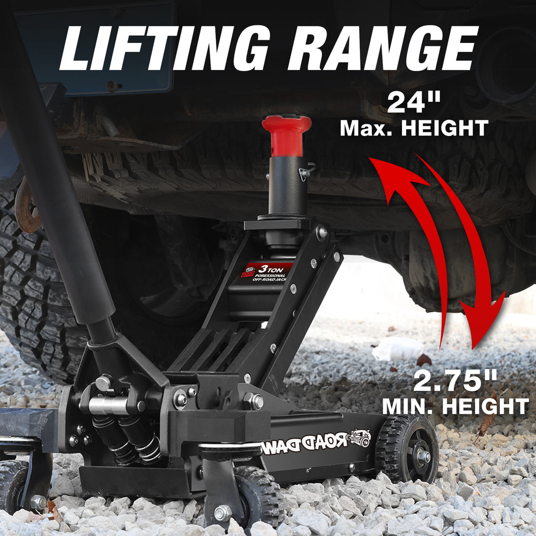 - The lifting range of professional big wheel off-road jack without adapters is 5.98"-20.87". Lifting range with SUV adapter is 8.98"-23.86"