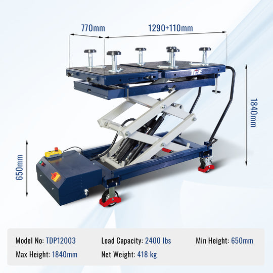 ELECTRIC POWER SYSTEMFeatures a 0.75kW dual-voltage motor (110V/220V) with push-button control for smooth 650-1840mm electric lifting and precise positioning. HEAVY-DUTY CAPACITY1200kg distributed load capacity with reinforced double-scissor structure and 1300x768mm platform for stable handling of large...Sale price $ 3,299.00Regular price $ 3,699.00Sale price $ 3,299.00Regular price $ 3,699.00 -