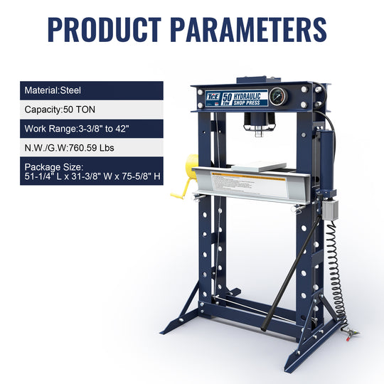 HEAVY-DUTY CAPACITY50-ton hydraulic press with 175mm bed opening and 0-890mm work range, designed for heavy-duty metalworking and repair tasks. PRECISE CONTROL SYSTEMEquipped with hydraulic air pump, pressure gauge, and adjustable release valve for accurate pressure application...Sale price $ 2,699.00Regular price $ 2,999.00Sale price $ 2,699.00Regular price $ 2,999.00 -
