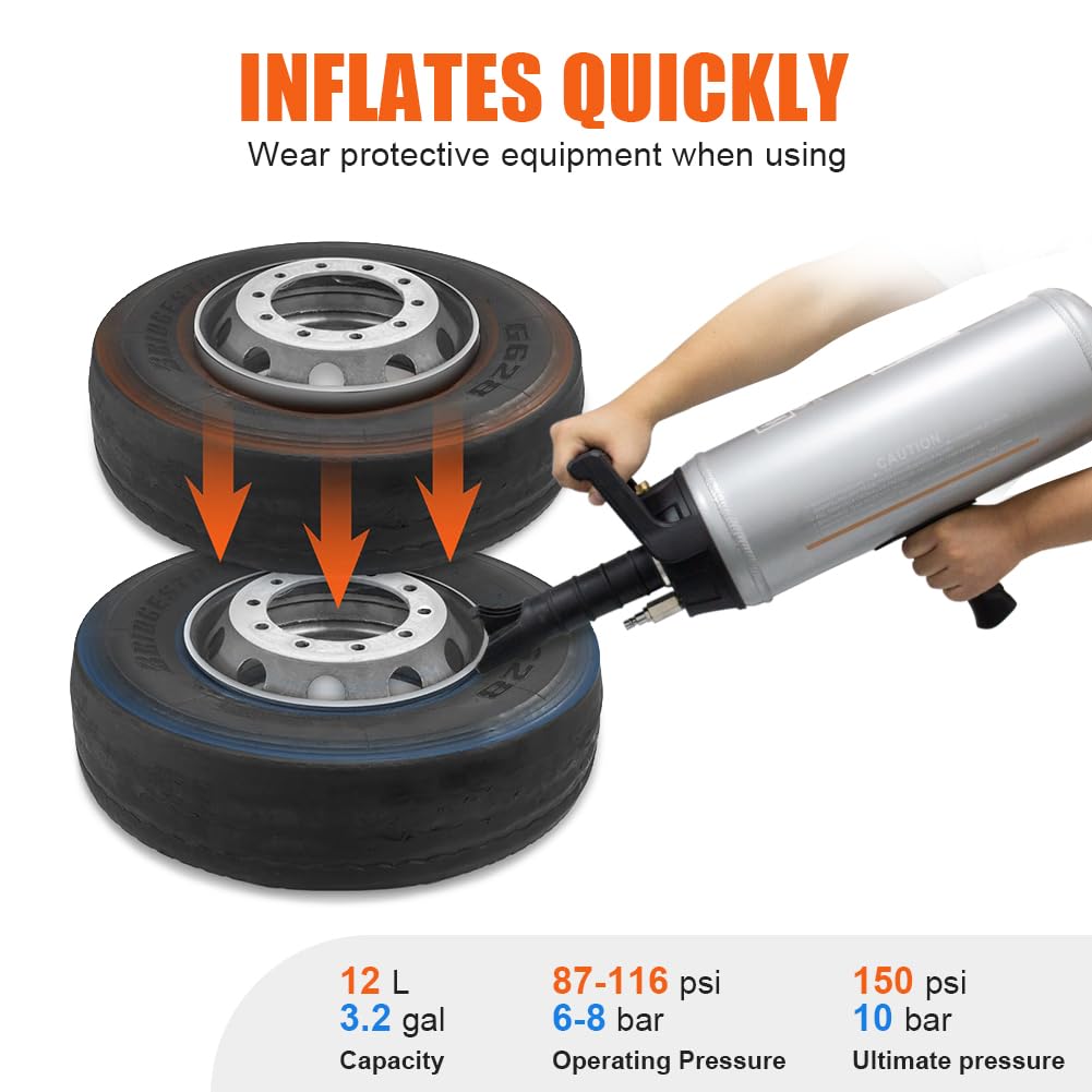 - Standard Sizes: 12 Liter / 3.2 Gallon portable capacity air tire bead seater blasting tool