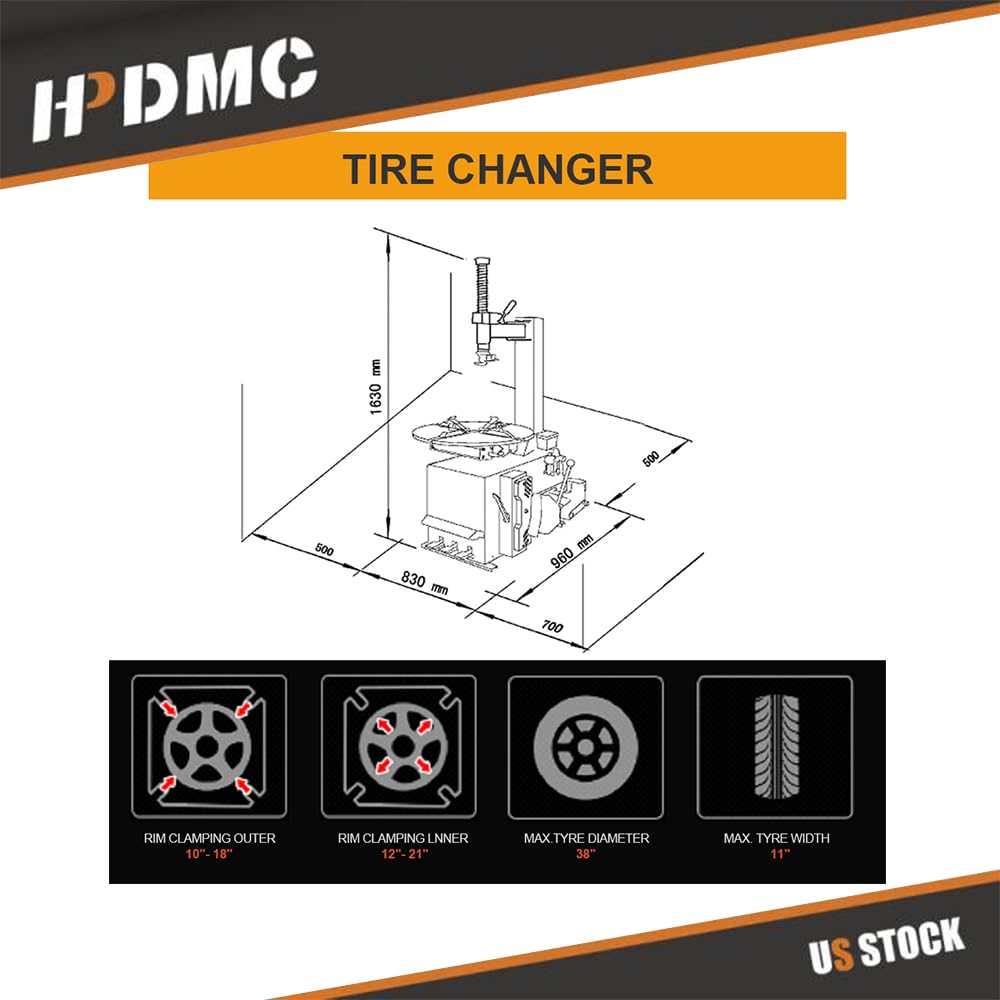 - Specification: Voltage: 110V/60HZ; Power: 0.75KW/1.5HP; Working Pressure: 8-10Bar; Wheel Clamping system: 4 Clamps-Internal; Rim Clamping Outer: 10''-18''; Rim Clamping Inner: 12-21''; Max.Tyre Diameter: 38''; Max.Tyre Width: 11''