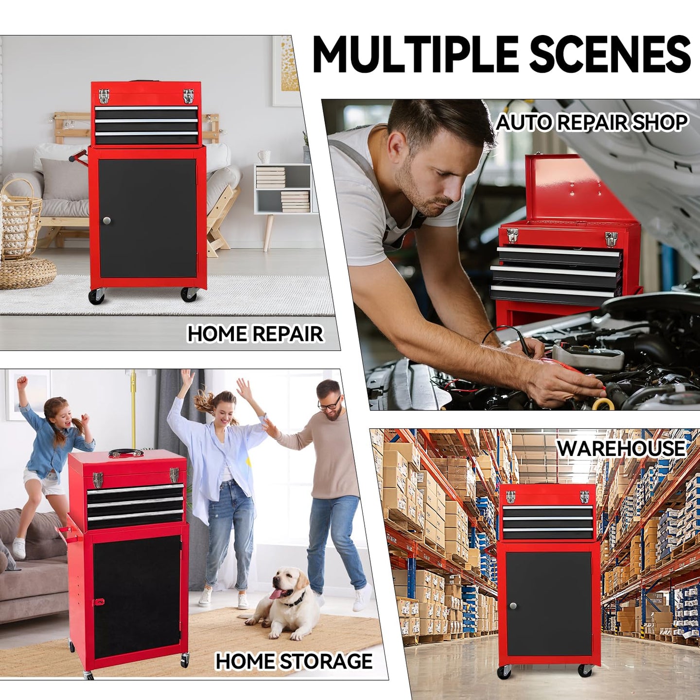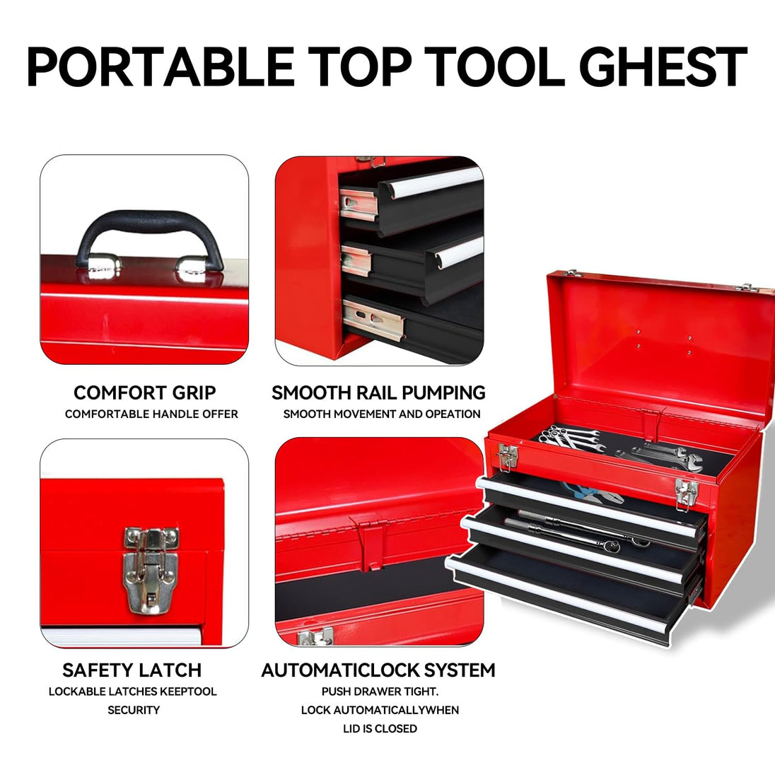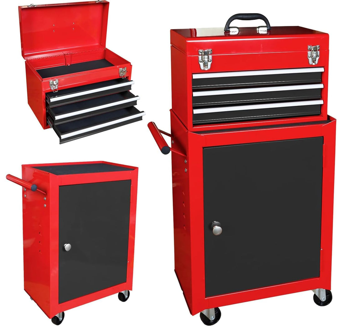 - Top tool chest features three pull out drawers fitted with slide rails, allowing for smooth operation; Bottom storage cabinet features an adjustable shelf and is lockable to keep your tools protected