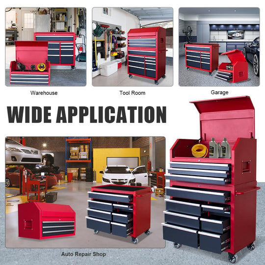 Heavy Duty Rolling Tool Chests and Cabinets Combo 36 in. 36" W x 24.5" D x 61.7" H product dimensions Heavy-duty 20 Gauge welded steel construction 9-drawer tool chest and cabinet set, drawer liners included Four...Sale price From $ 916.98Regular price $ 1,199.00Sale price From $ 916.98Regular price $ 1,199.00 -