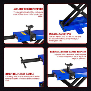 - Easy to Operate: Just rotate the metal crank to lift motorcycles easily; The jack is ideal for the gar