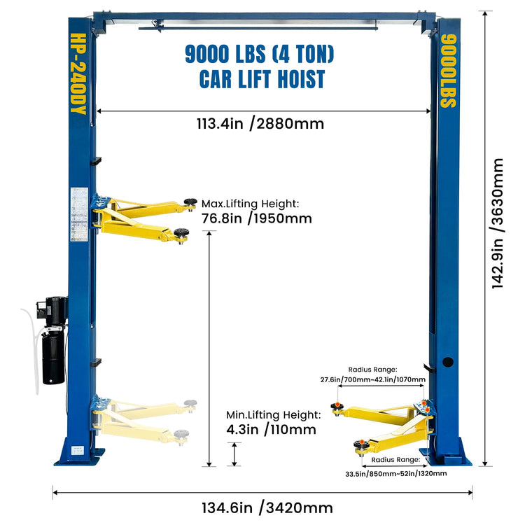 Top hydraulic system, 110 V ; 9,000 lbs Capacity, Driven by dual hydraulic cylinders; Auto Car Lift is CE certified.Standardized for 115% dynamic load capacity and tested for 150% static load capacity