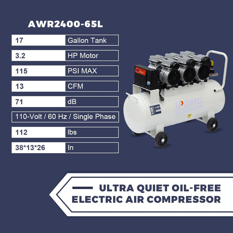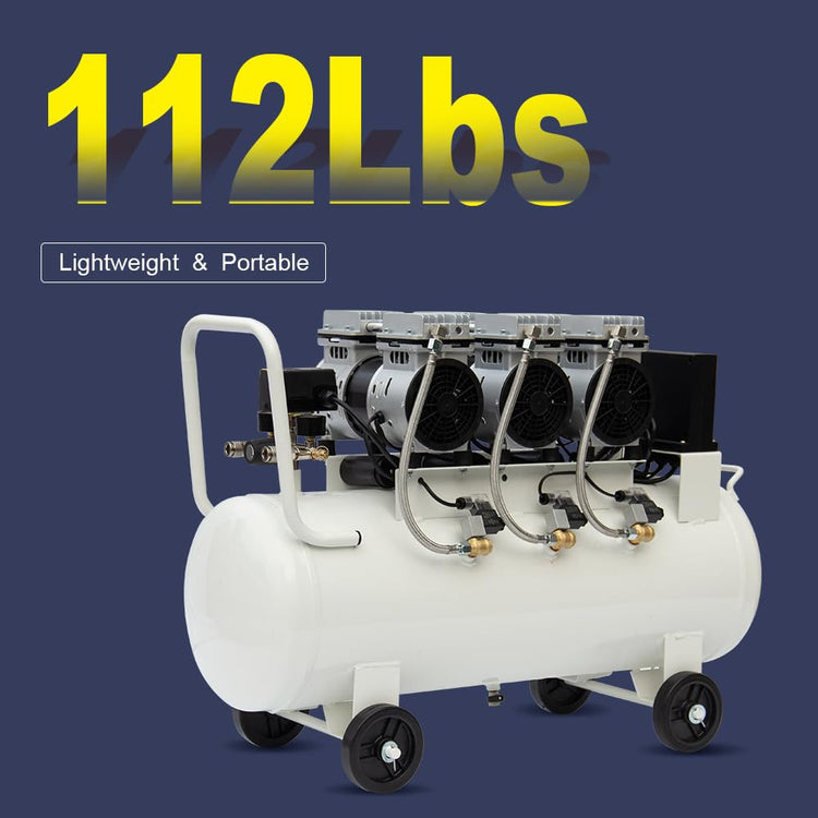 - Portable Oil-Free Design: The Compressor oil-free design eliminates the need for you to change the oil regularly for easy, continuous use, and also means that it works seamlessly even in cold weather conditions, and provides better tool handling and reduced costs. This electric oil less air compressor weighs only 112 pounds, so you can take it with you to any job scenario you want to go to, it's that convenient