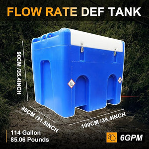 - Wide Application: 114 gallon DEF transfer tank system comes with everything you need to safely and cleanly transfer Diesel Exhaust Fluid.It is used in many fields, including tanker trucks, outdoor industries, construction industries, etc
