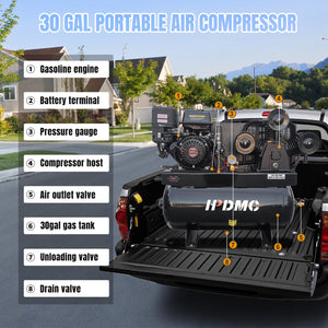 - Details Parameters: Power: 13HP; Tank: 30 Gal ASME; Max. Pressure: 180PSI; Air Flow Rate: 24CFM; Speed: 880 rpm; Type of Driven: Gasoline; NO. of Cylinders: 3; Output Pipe Diameter: NPT 1/2''; Combination Valve: Sufficient Sensitivity, Stability and Safety; EPA Certificate NO.: RCGPS.4202GR-019
