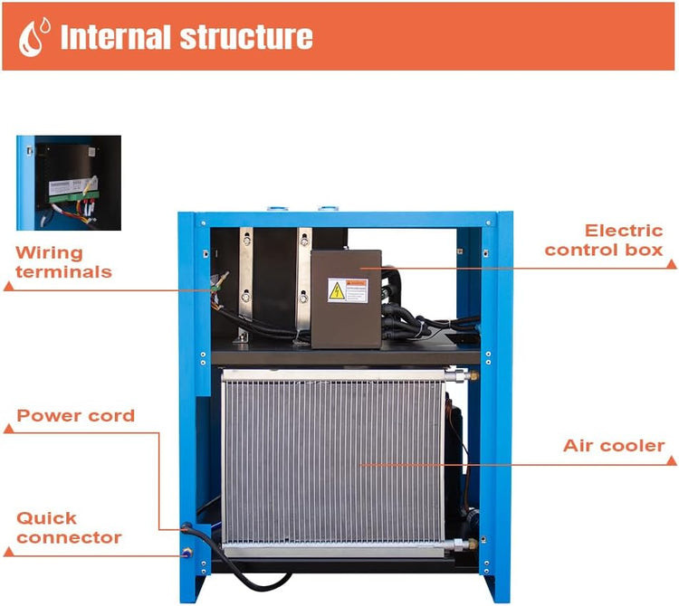 - Specification: Power: 0.75KW; Voltage: 110V/60HZ/1PH; Air Flow Rate: 70CFM; Output Pipe Diameter: NPT 1''; Refrigerant model: R134a