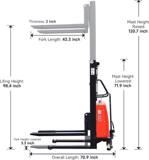 - Compact Design for EU Type Pallet: Load capacity 3300lbs, perfect stacking and pallet positioning as well as stocking and refilling shelves. The Max lift height 98", fork lowered height 3.3", lifting and lowering speed can be adjusted according to customer's requirements.