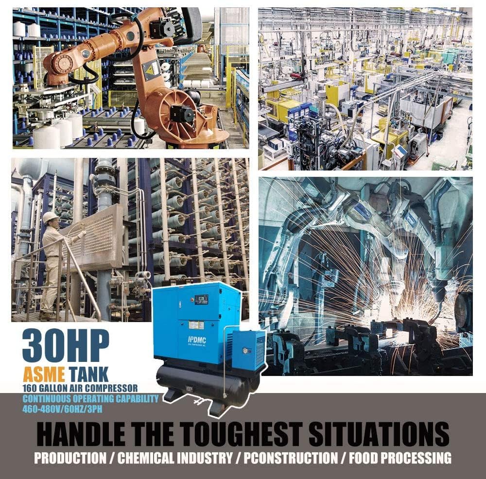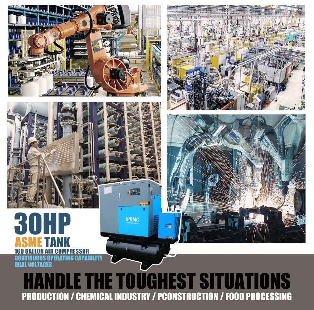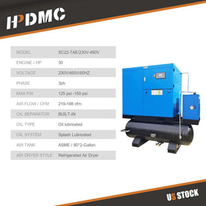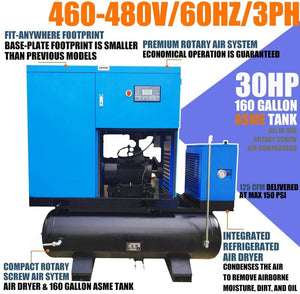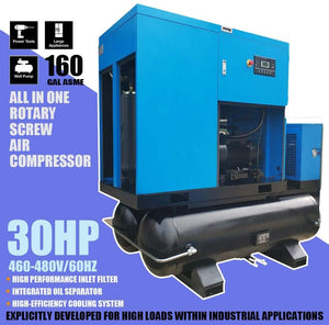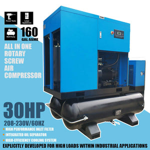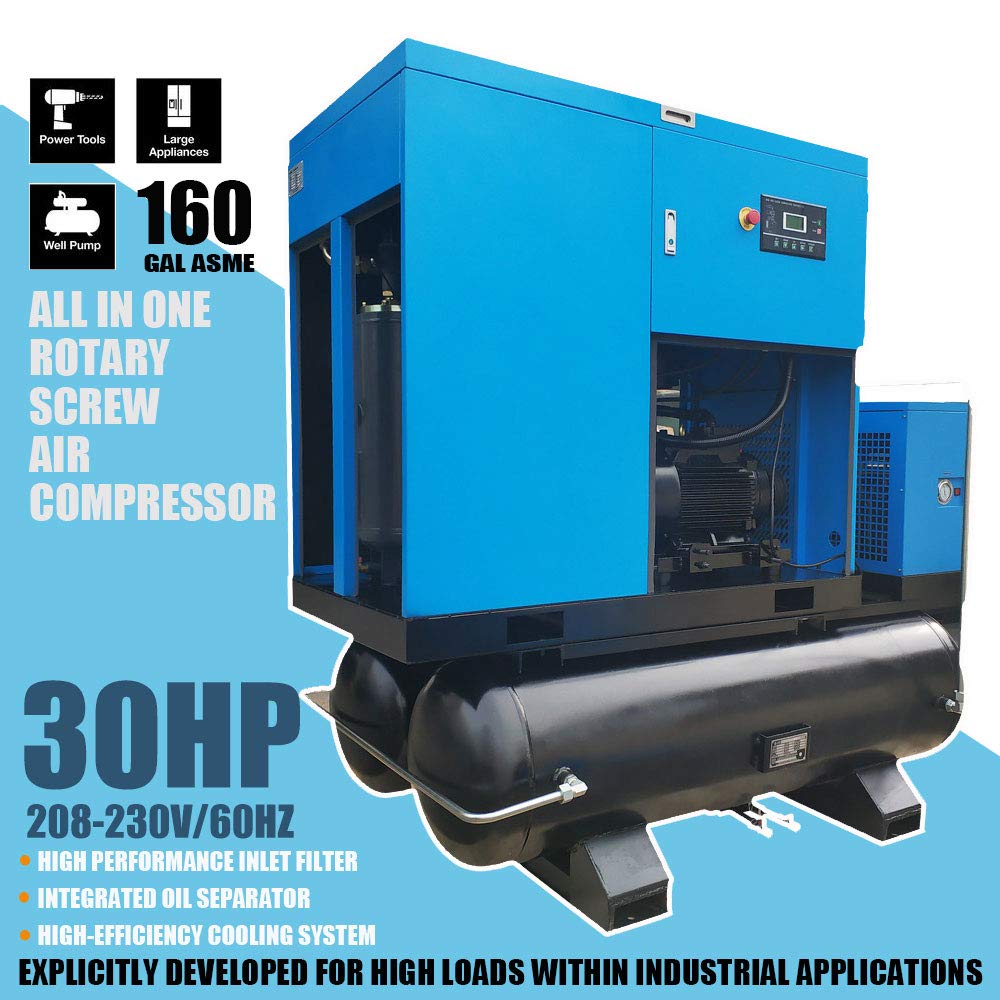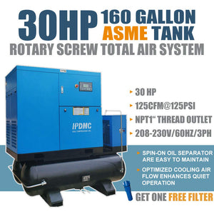 - Parameters: Power : 30HP;Input Voltage: 208-230V/3Ph;Air Flow : 125cfm;Max Working Pressure : 125 psi / 8 bar;Motor : 3600rpm;All-in-one Compressor With Air Dryer & 160 Gallon Tank. Efficiently condenses the air to remove airborne moisture, dirt, and oil