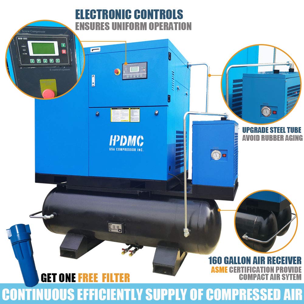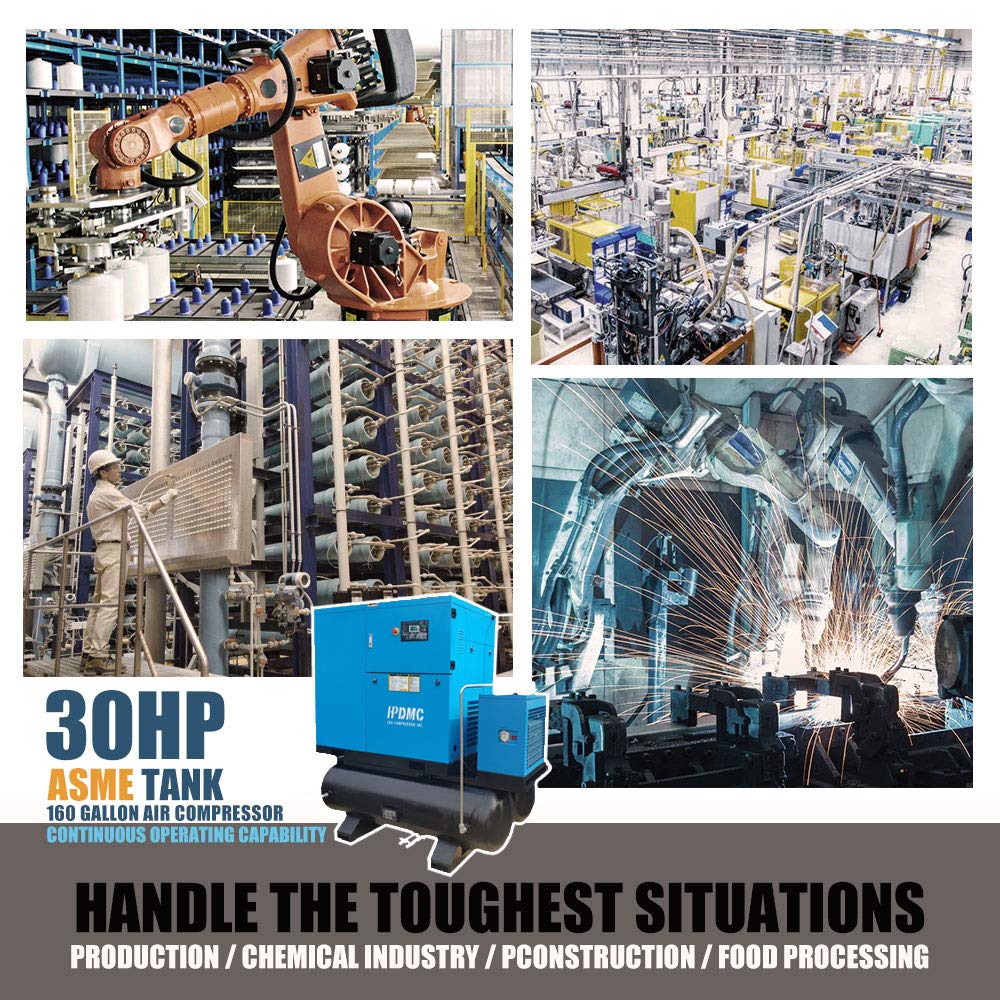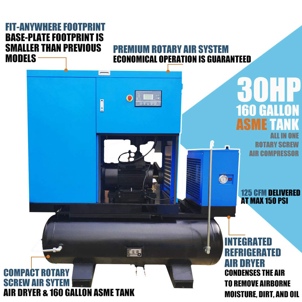 - Compact & Quiet Performance Air System: Modern and quiet design sound enclosure removes easily for fast servicing, All-in-one Compressor With 160 Gallon Tank and Integrated Refrigerated Air Dryer, help to condenses the air to remove airborne moisture, dirt, and oil. Design delivers 68DbA sound level with extremely low maintenance requires a minimum amount of floor space